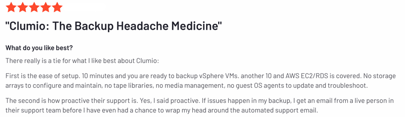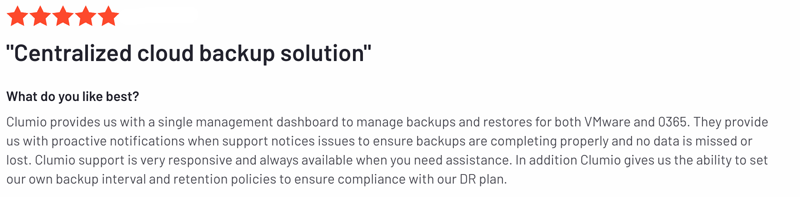 To see what real customers are saying about our support, check out these G2 reviews: https://www.g2.com/products/clumio/reviews